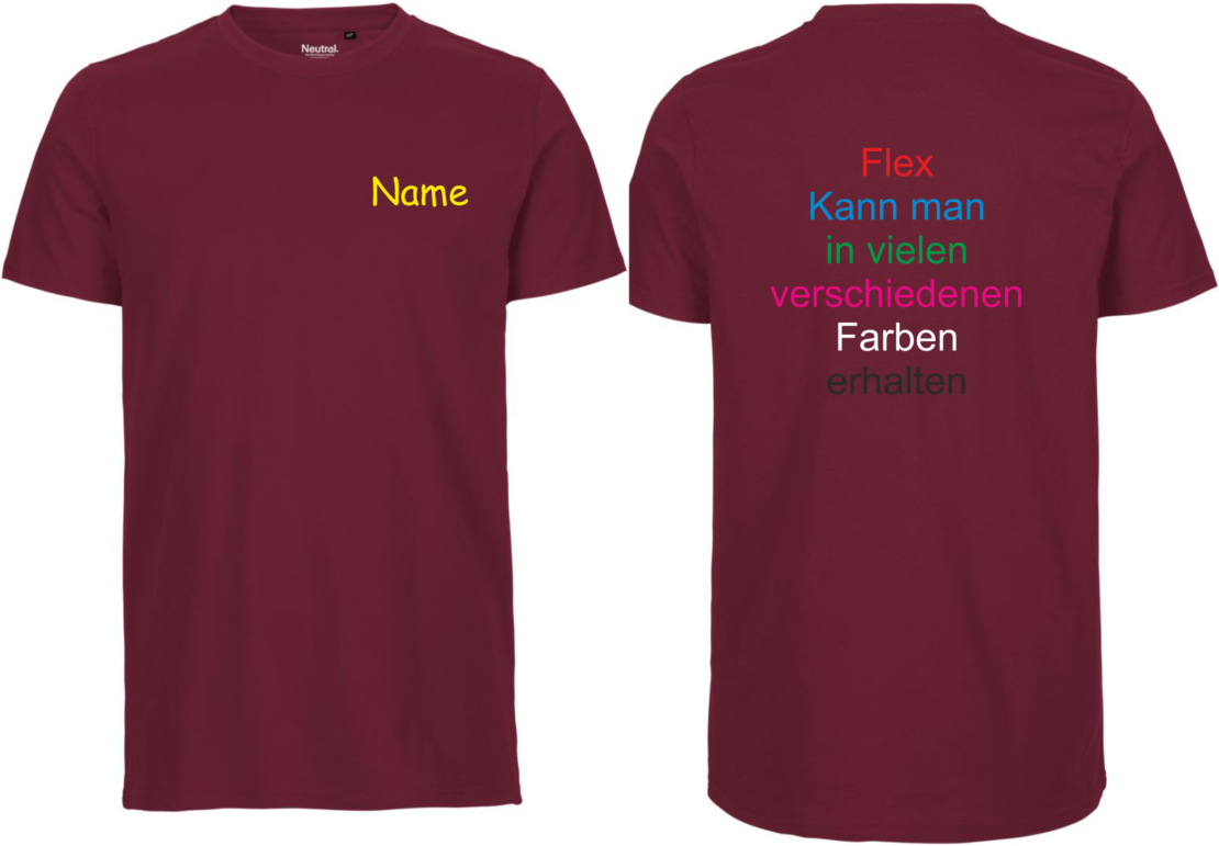 Flex ist ein durchgefärbtes flexibles Material in verschiedenen Farben das auf fast alle Textilien aufgedruckt werden kann. Flex ist extrem haltbar und bis zu 90 Grad waschfest. mehr